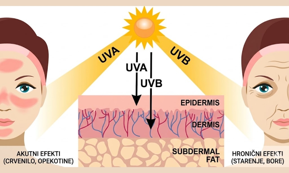 UVA zraci, sa druge strane, prodiru mnogo dublje u kožu i glavni su krivac za prerano starenje, bore i gubitak elastičnosti, ali takođe doprinose razvoju raka kože.